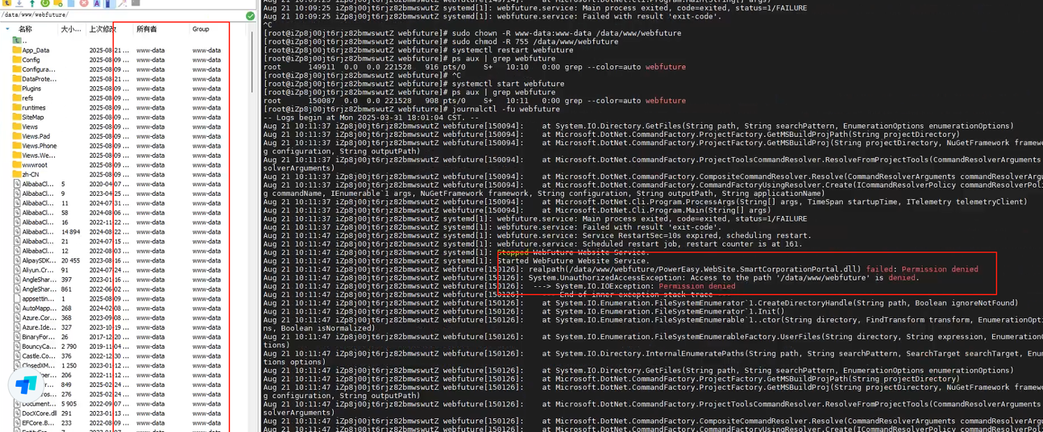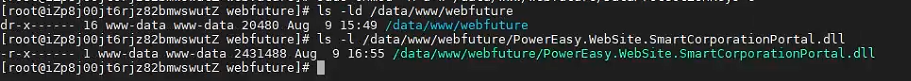 ls -ld /data/www/webfuture ls -l /data/www/webfuture/PowerEasy.WebSite.SmartCorporationPortal.dll