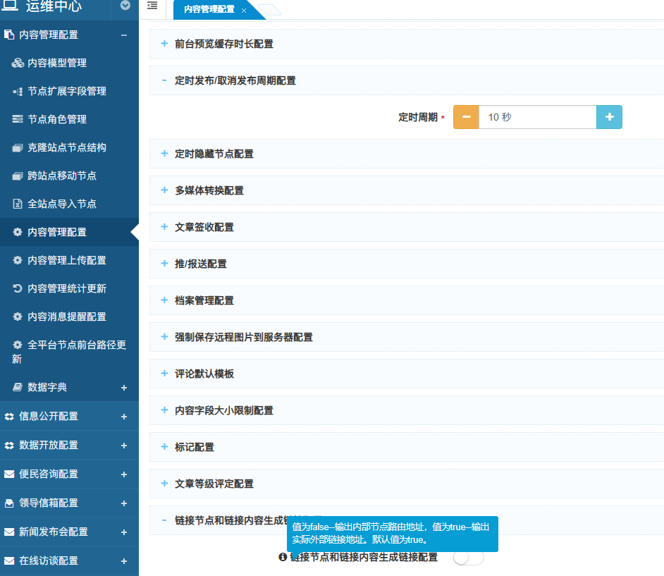 问题描述:1.信息公开列表为何能显示文章模型内容;2.列表显示标题和链接重复 解决方法:最开始以为是缓存或文章的RootNodeID、MasterNodeID错乱,节点左右值错乱等;结果查下来都不是。最终发现是这个开关的作用;开启后会把外链文章地址输出为最终被跳转到文章链接,所以上图中的问题只是在信息公开栏目下,有两篇都跳转到同一地址都外链文章,并不是数据重复。