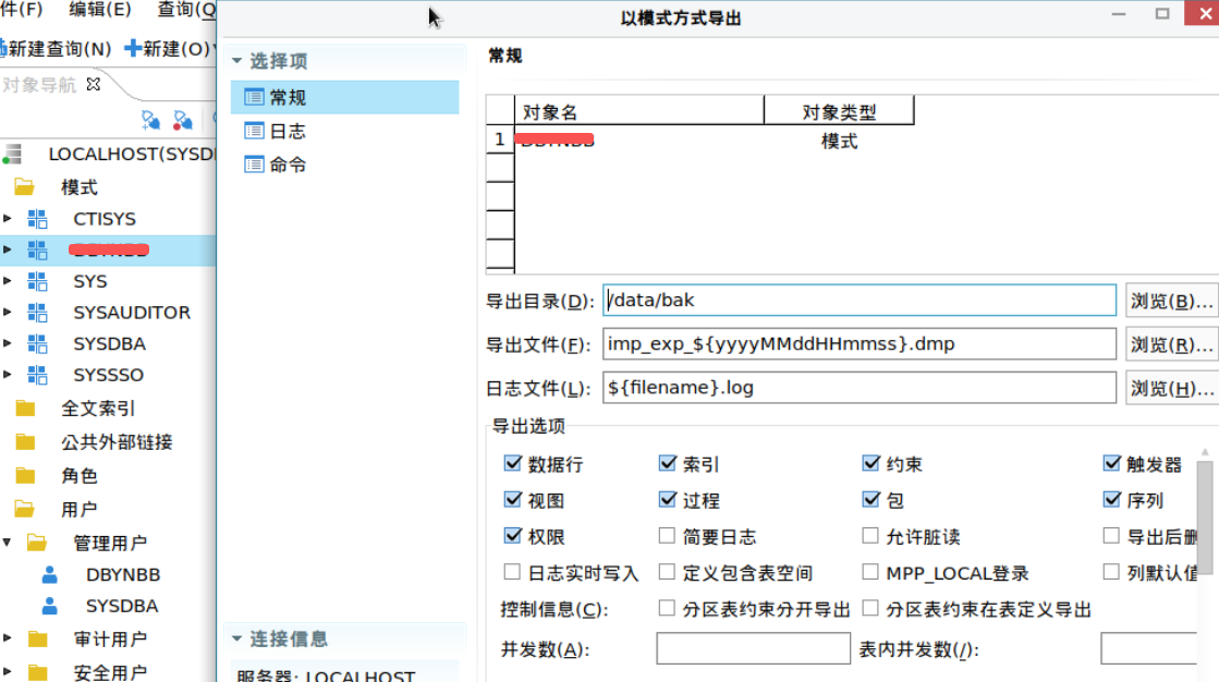 ./dexp userid=SYSDBA/'"密码"'@127.0.0.1:5236 DIRECTORY=/data/dmdba/bak/ file=xx20251211.dmp log=xx20251211.log schemas=模式名