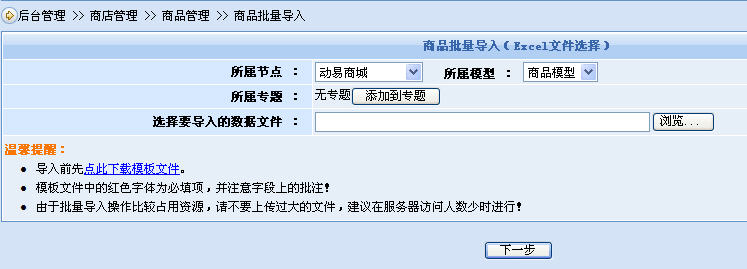 图1是商品批量导入的操作首页。我们看到,这里将商品所属的节点与模型、专题独立在商品列表(列表采用Excel文件保存)之外,即每个商品列表将只可一次导入到一个节点的某一个模型或某个商品专题之中。
