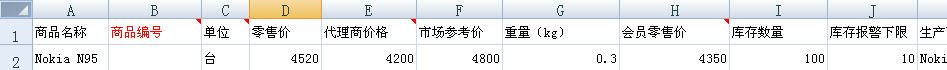 下载模板文件(Products.xls),并根据模板格式添加商品数据。我添加了1条数据:Nokia N95。