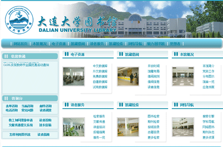 大连大学图书馆 网站作为大连大学图书馆的信息门户,是图书馆面向读者的统一信息服务平台、是展示图书馆形象与综合实力的窗口。通过该平台,读者可以根据自己的喜好和兴趣方便地利用各种数字资源,享受高校数字图书馆提供的各项服务。