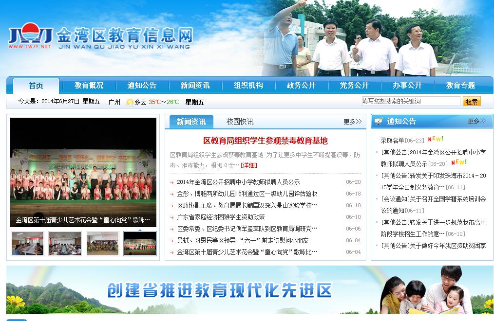 珠海市金湾区教育信息网(www.jwjy.net)是由金湾区教育局主办的教育门户网站, 是金湾教育在互联网上对外展示的窗口,是发布金湾区权威教育信息、公开教育党务、政务信息的重要平台,是广大师生、家长和社会公众了解金湾教育、关注金湾教育的网络媒介。金湾区教育信息网自2013年7月上线以来,充分整合政府信息资源,实现教育资源教育信息共享,为金湾区电子政务乃至珠海市在地区教育局门户领域树立领先形象,极大提高金湾区在相关领域的技术水平和管理服务理念,成为金湾区电子政务的中坚力量,真正做到“全心全意为人民服务”。