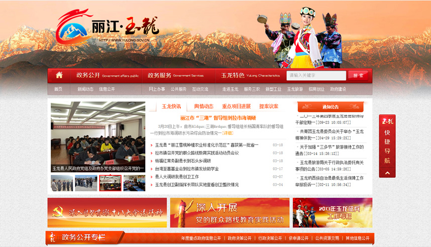 玉龙县政府门户网站通过动易内容管理系统,采用文字、图片、视频等多种展现形式,发布与玉龙相关的各类新闻信息,包括玉龙快讯,提案议案、通知公告、视频新闻、乡镇之窗、部门动态、政策解读、舆情动态、重点项目进展等栏目,有效加大政府信息的公开。