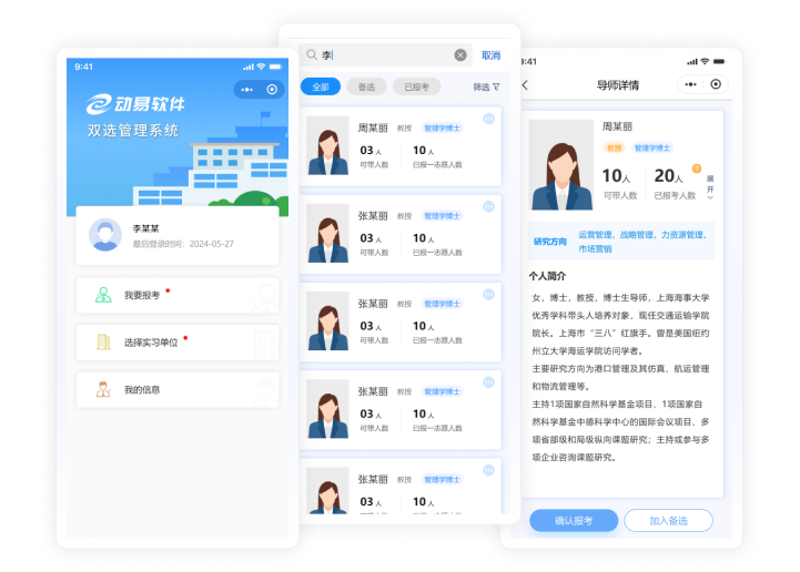 在小程序主页点击“我要报考”后,系统将展示导师列表,学生可以根据职称、学历、研究方向等条件筛选导师。点击导师名称可以查看其详细信息以及报考该导师的相关数据。学生可以将导师加入备选或取消备选,并最终确认报考。