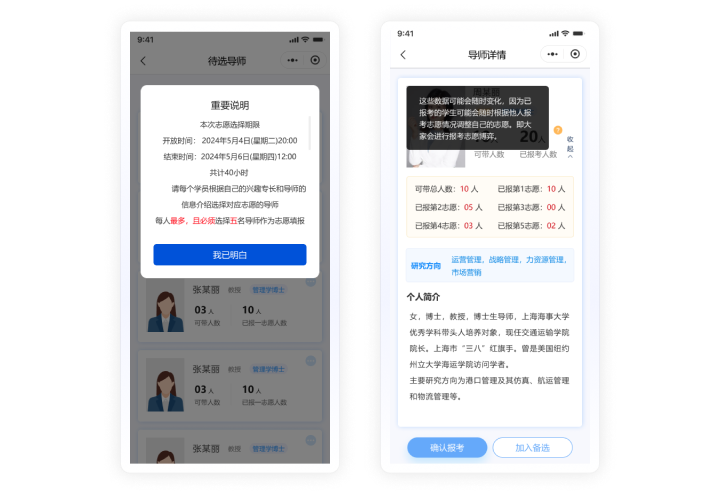 在报考截止时间之前,学生可以随时查看和调整报考志愿,包括取消报考或通过拖拽方式调整志愿顺序。每个导师的报考名额有配置限制。