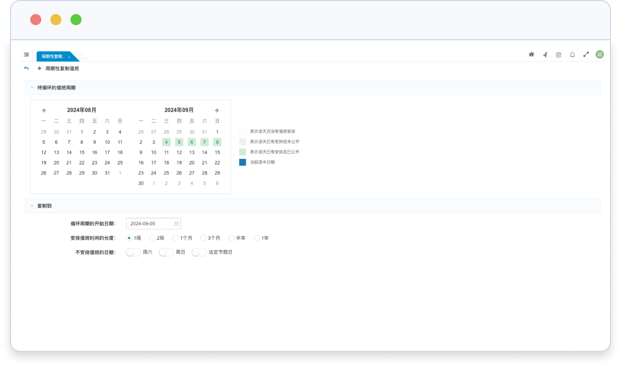 - 支持将某一天已排好的值班信息复制到其他日期,以便在多天排班信息相同时一步完成,提高排班效率。