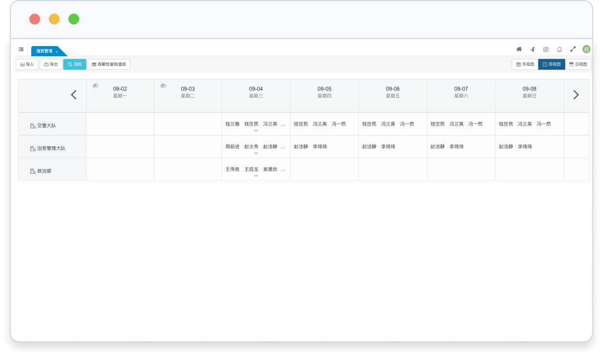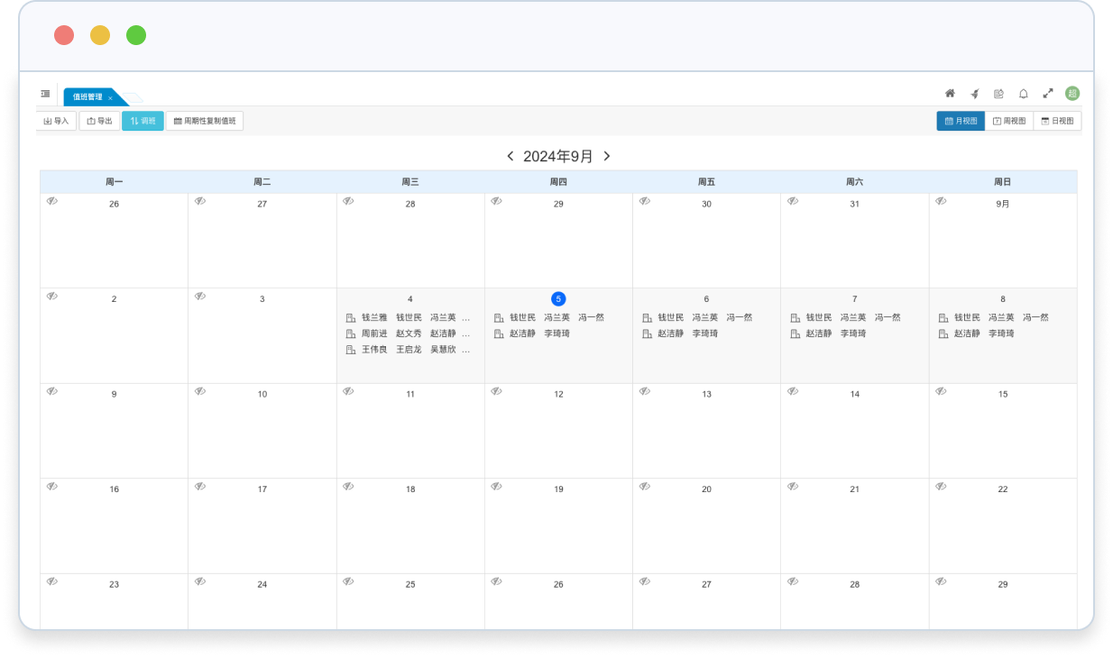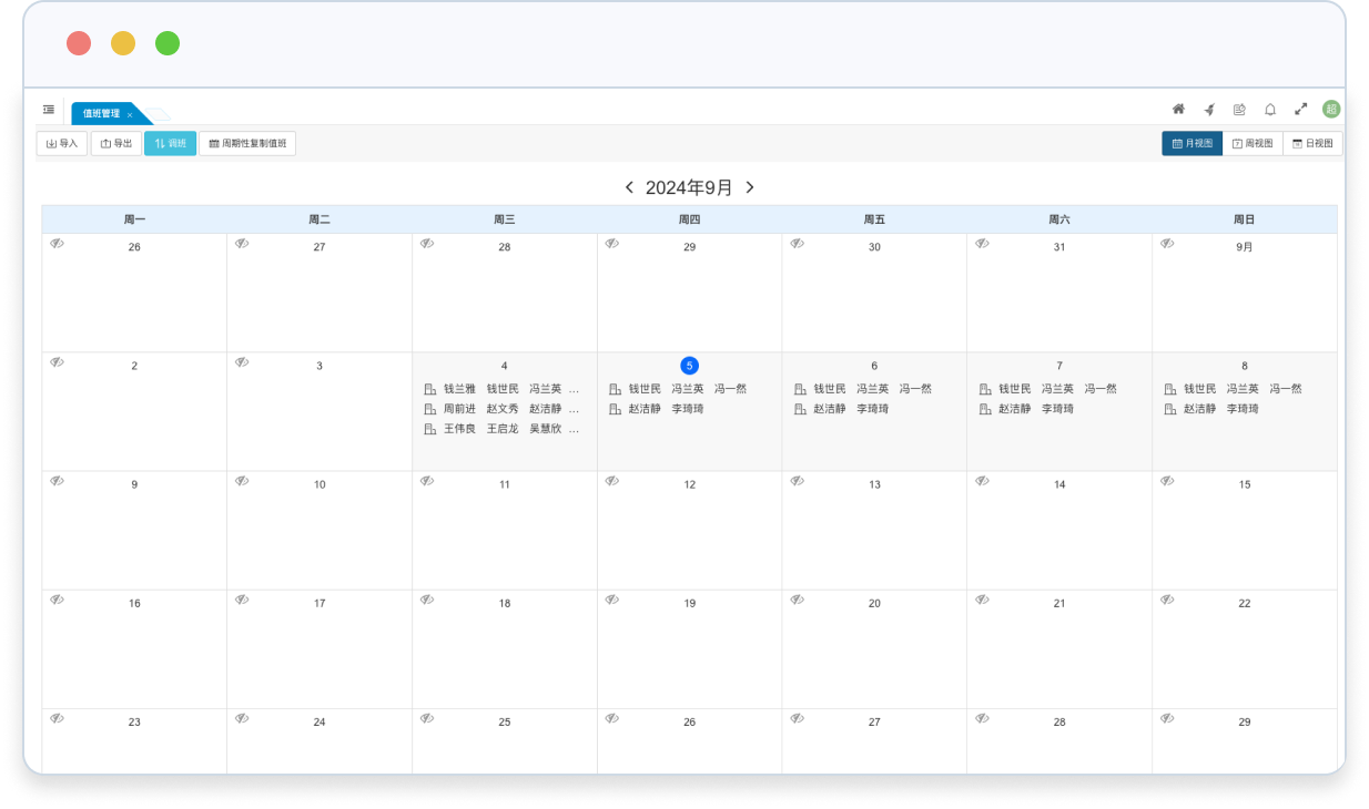 - 支持按日视图、月视图模式和周视图模式对值班信息进行管理,不同视图适用于不同值班人员规模的排班需求。