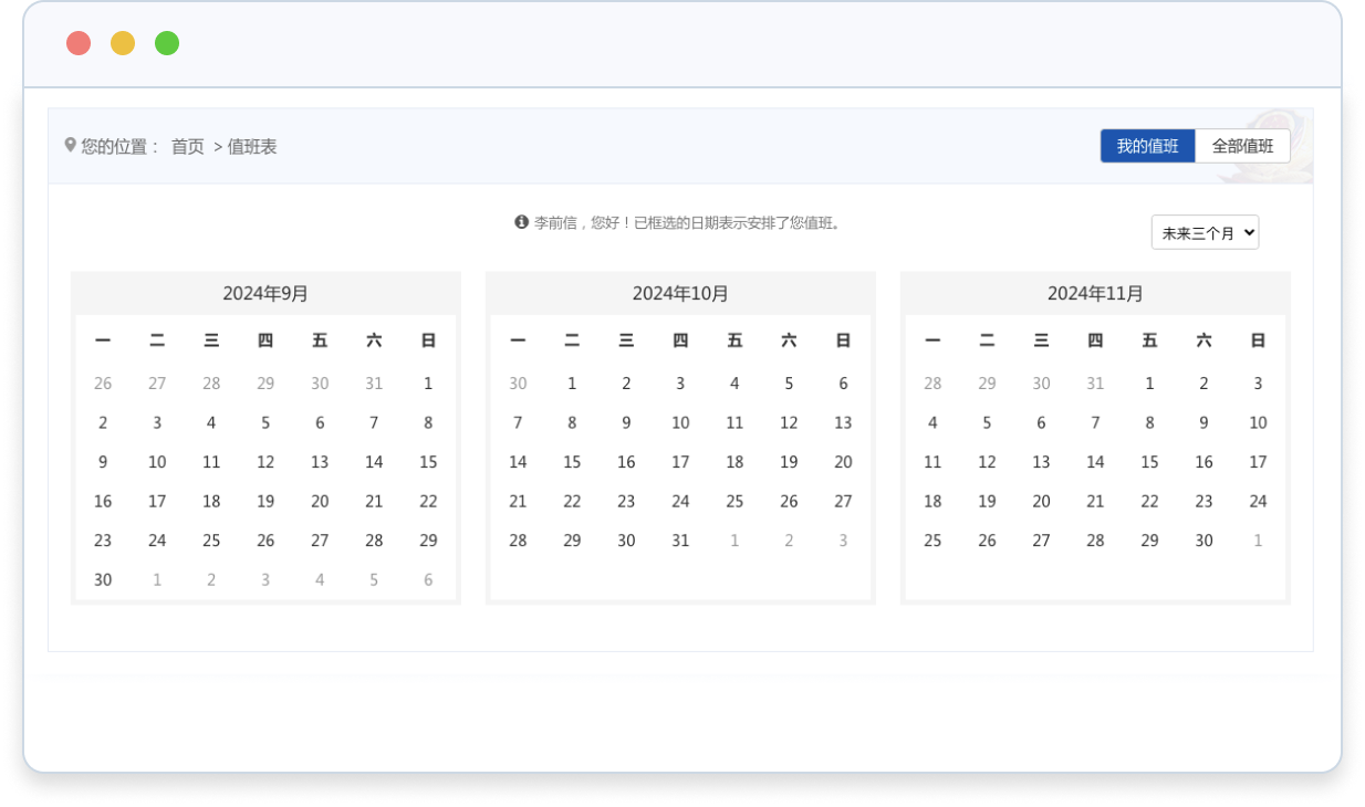 - 支持“我的值班”功能,当用户已登录时,可以访问“我的值班”页面,页面以日历方式显示当前用户的值班安排(已框选的日期表示安排了值班)。