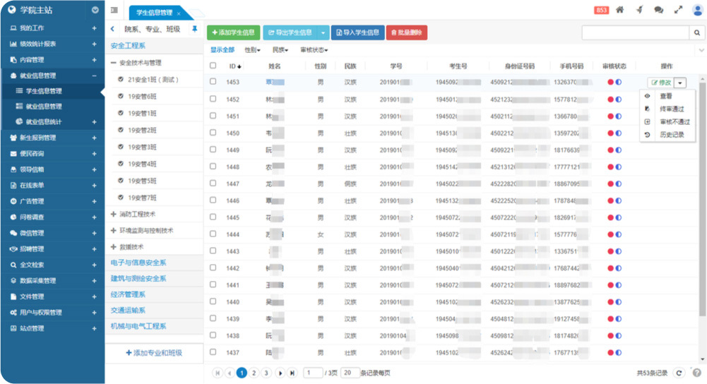此外,班主任(辅导员)登录系统后可查看其负责的班级信息,查看、修改、审核毕业生的就业信息。