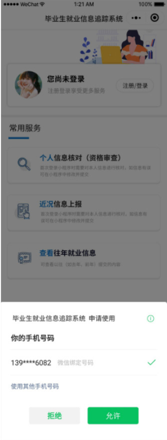 毕业生登录小程序学校或班主任利用微信群等多种渠道发布填报通知,毕业生接获通知后,通过扫描通知中二维码快速进入小程序。小程序自动申请获取当前微信账户关联的手机号信息,并与毕业生数据库进行精准匹配: