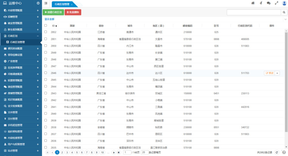 支持行政区划代码的添加、删除、修改、查看等功能。