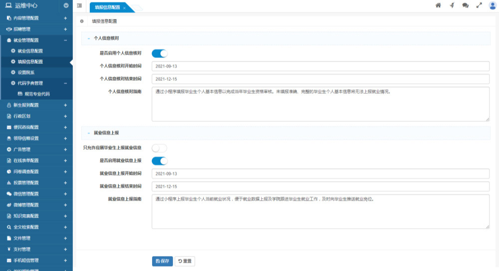 支持设置是否开放信息上报、信息上报的开始时间、截止时间、信息上报小程序中的指南性文字描述等内容。