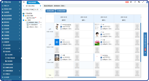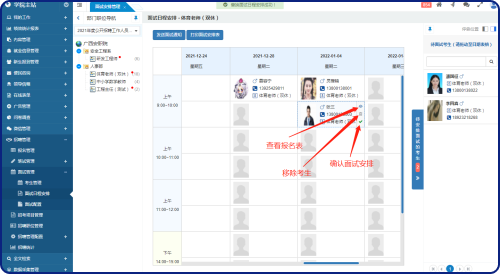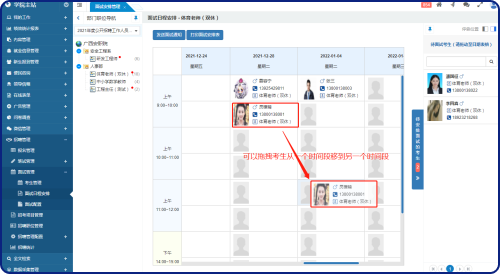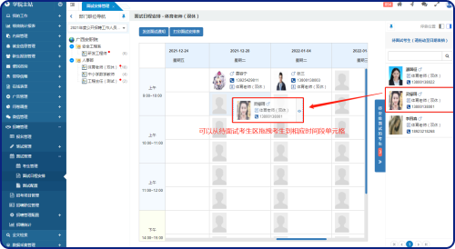 在这个面试日程安排界面中,可以将“待安排考生”拖拽到未安排面试的时间段的单元格中;可以拖拽考生从一个时间段到另一个时间段;假如一个时间段里有多个考生,可以拖拽考生进行排序;已安排好的考生,可以移除以重新安排。