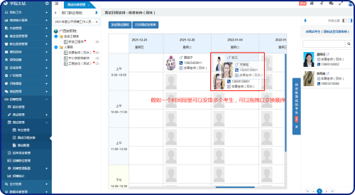 面试日程安排表的列为指定的面试日期,行为面试时间段,每个单元格为这个时间段的已安排面试考生及报考班级。点击左侧的招生班级时,而面试日程安排表则筛选出这个班级的已安排面试考生,未安排考生的时间段“虚位以待”。点击右侧的“待安排考生”,则面试日程安排表筛选出这个考生对应的班级的已安排面试考生。可以将“待安排考生”拖拽到未安排面试的时间段的单元格中。可以拖拽考生从一个时间段到另一个时间段。假如一个时间段里有多个考生,可以拖拽考生进行排序。已安排好的考生,可以移除以重新安排。