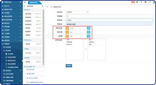 设置科目名称、适用班级(多选)、开始考试时间,结束考试时间、满分、及格分。每次招生考试项目的笔试科目可能并不一样,每次添加的考试科目默认属于当前招生考试项目。
