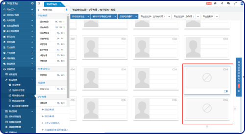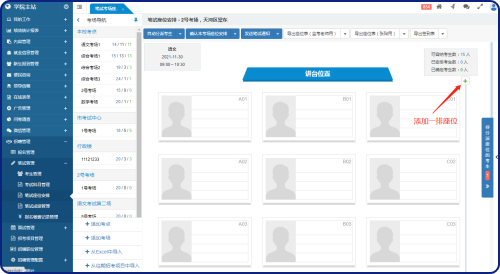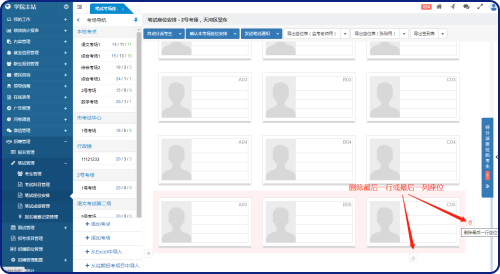 考场管理:创建、修改、删除考场、考场排序。添加好考场后,根据容纳考生数自动添加好笔试座位记录(类似飞机航班的座位安排,座位的考生先为空,待后续分派考场时填入)。