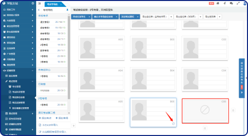 笔试考生管理的界面与报名管理类似,中栏为本次招生考试项目的班级列表,每个班级名称后显示相应的进入笔试流程的考生总数,假如有“待安排座位”的考生,则用红点进行提醒。中栏顶部支持切换招生考试项目。