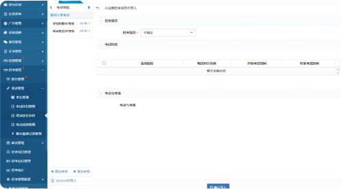 导入考点和考场:支持两种导入方式,一种是从Excel中直接导入考点和考场。另一种是从往期招生考试项目中导入。确定导入后,则将选中的考点、考场、考试科目,以及考场和考试科目的关联关系(排除掉没有选中的科目)都复制导入,并将相应考场的座位记录也复制为新考场的座位记录(哪些座位是禁用的,同样禁用)。以减少在后续的招生考试项目中安排考点、考场和座位时极大的减少工作量,提高工作效率。