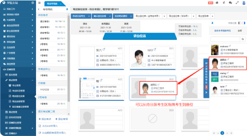 提供座位调整、自动分派考生座位、手动分派考生、确认座位安排、导出座位表(监考老师用)、导出座位表(张贴用)、导出签到表功能。以及为所有考场自动分派考生、确认所有考场的座位安排、导出所有考场的座位表(监考老师用)、导出所有考场的座位表(张贴用)、导出所有考场的签到表操作。