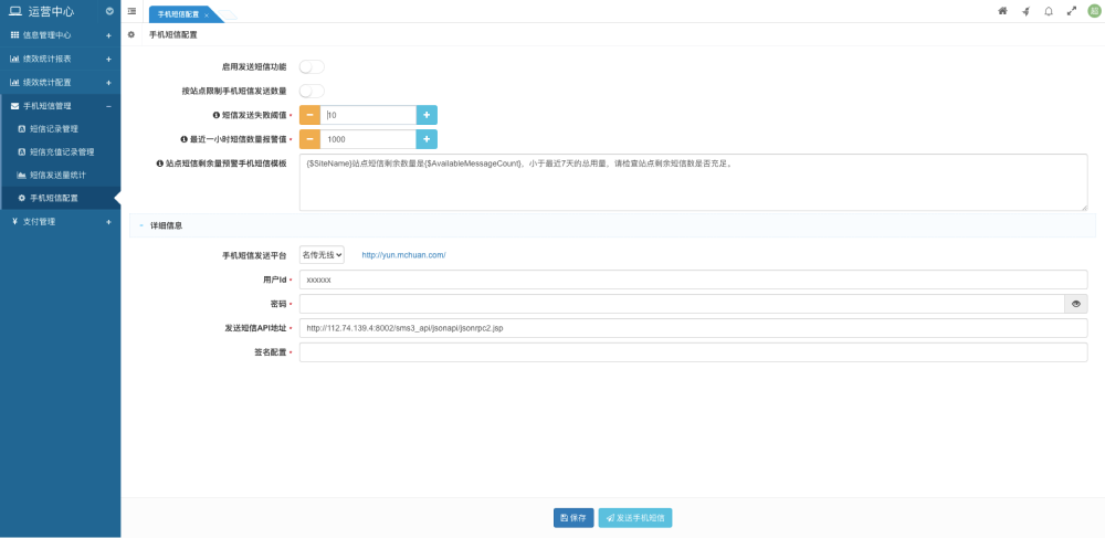 当发送失败次数达到 N 次的不同手机号码的短信数量累计到 10 条时(这可能意味着短信平台出现问题),系统将向平台超级管理员发送站内短信和邮件进行报警(因为此时手机短信功能可能不可用)。