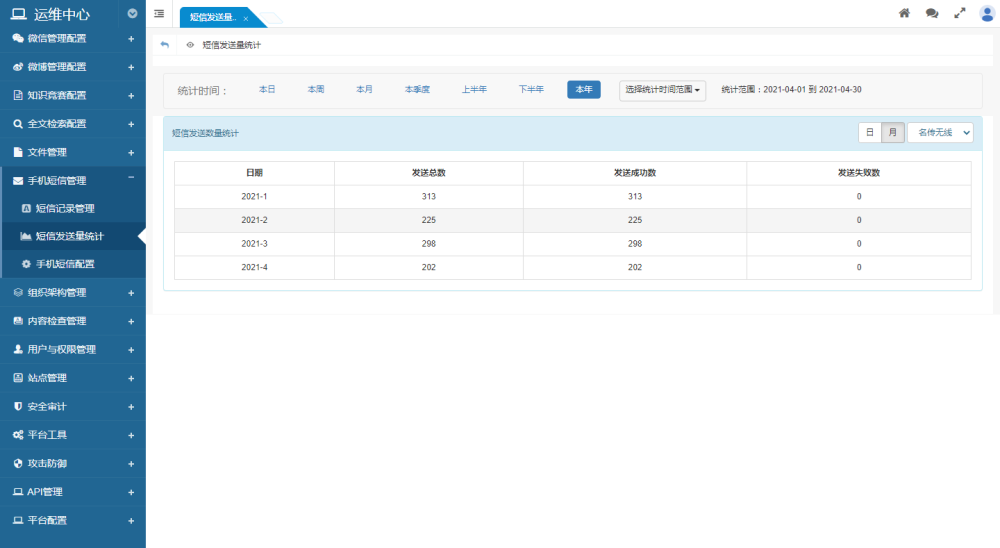 提供按日和按月两种统计表。统计每日/每月发送的短信发送总量、发送成功数量、发送失败数量。便于与短信服务商进行对帐。