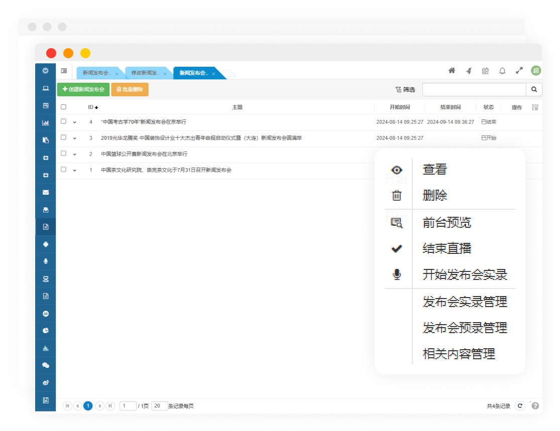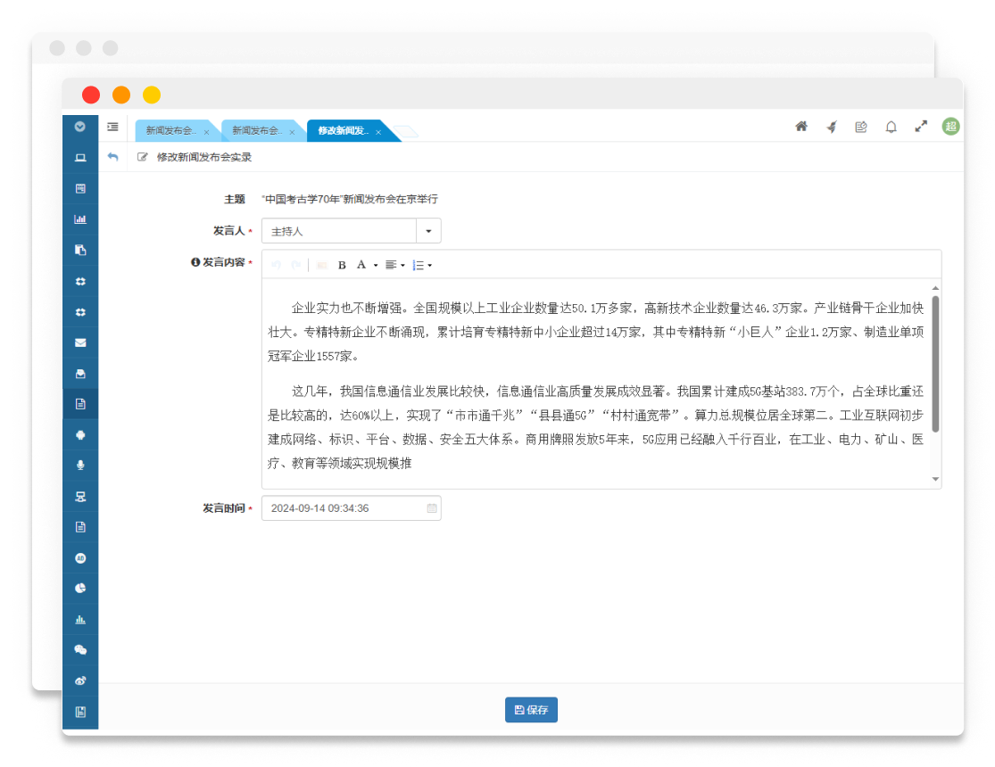 系统涵盖新闻发布管理、发布会预录管理、视频直播与录播、新闻图文直播(实时推送)、网友提问、相关内容管理与分类管理、新闻发布会配置等功能模块。支持图文直播与视频直播功能,并内置文字敏感词过滤功能,确保发布内容的安全与合规。