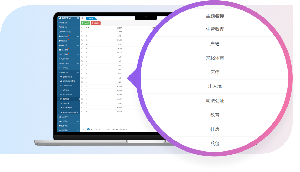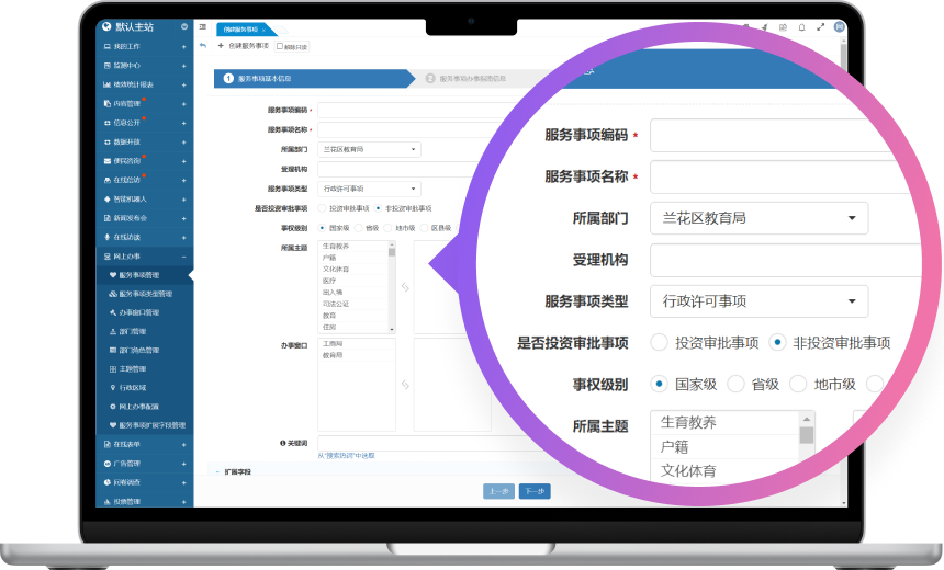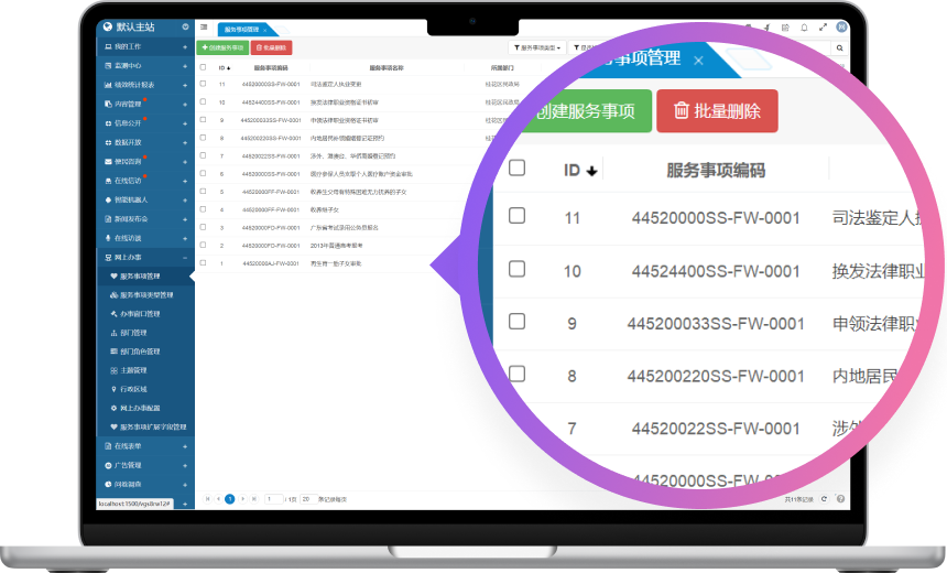 该系统集成了多个核心功能子模块,包括服务事项管理、办事窗口管理、部门管理、主题管理、行政区域管理等功能子模块。