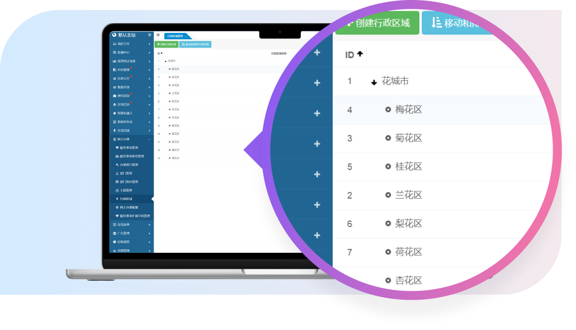 支持创建、修改、查看、删除行政区域,还提供了搜索与筛选功能,让用户能够迅速定位到目标行政区域。