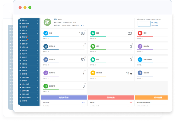 我的工作台首页依据用户权限,集中展示各模块的统计数据、待审核信息及监测中心相关数据,用户可通过点击相应数字直接跳转至对应模块进行处理。