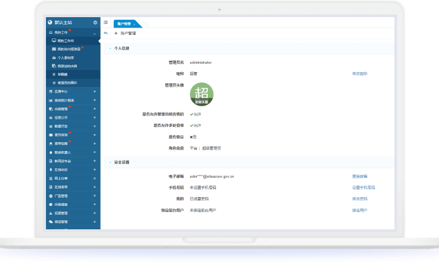 管理员工作台系统是每个软件系统的标配功能,主要为每位管理员提供个性化设置功能,包括更新个人信息、修改密码以及安全退出登录等。