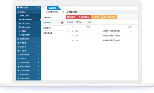 当有未读短消息时,管理后台右上角的短消息图标会显示具体的短消息数量,并且“我的工作”及“我的站内短消息”菜单项会以红点标记提醒。