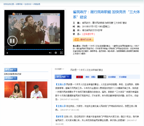 随着政府网站建设工作的不断加强,目前,在线访谈已经成为政府门户网站互动参与程度重要内容之一。而随着Internet网络的不断发展,网络上传输的资料不仅仅限于文字和图形,网络视频成为一种更即时、真实、直观、全面的信息传播工具,也成为宣传、公关、信息传播的新传播手段。动易SmartGov政府网站管理系统5.0在线访谈新增视频在线直播功能,支持对嘉宾访谈现场互动情况进行网络视频直播和录像资料的在线播放,只需要填写访谈页面上填写访谈视频直播地址即可。