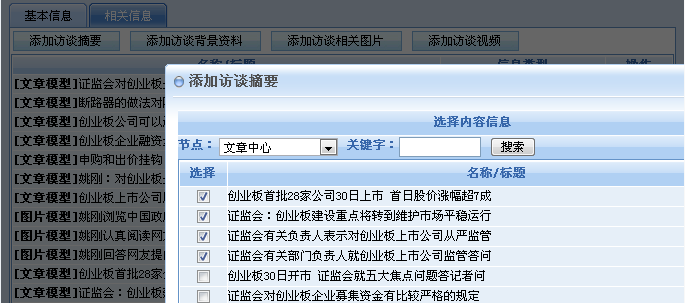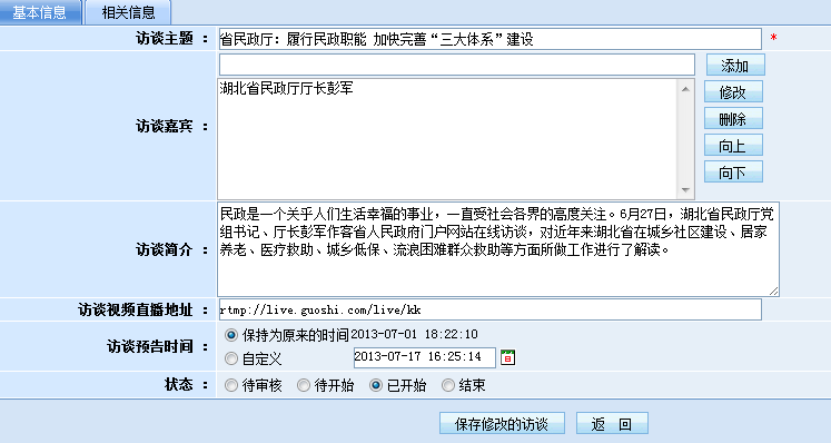 当需要创建新一期的在线访谈节目时,用户简单录入访谈主题、嘉宾、简介、访谈视频直播地址、开始时间、摘要、背景资料等信息后,便可快速创建起新的访谈节目。