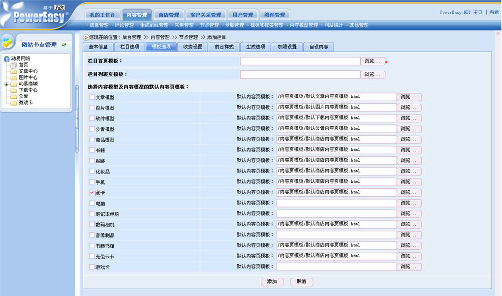 建好商品模型之后,我们还需要在商城下添加一个游戏充值卡的商品栏目,并选择设置好该栏目的内容模型(即商品模型)与栏目模板。