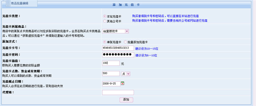 最后就是需要添加充值卡了,需要到“充值卡管理”里面添加单张充值卡或者批量生成充值卡。需要注意的是要正确选择充值卡所属商品,也就是所生成的充值卡要对应属于上面所添加的充值卡商品,否则充值卡将无法正常出售。另外“充值卡点数、资金或有效期”也要注意要与所属商品中所描述的点数相同。