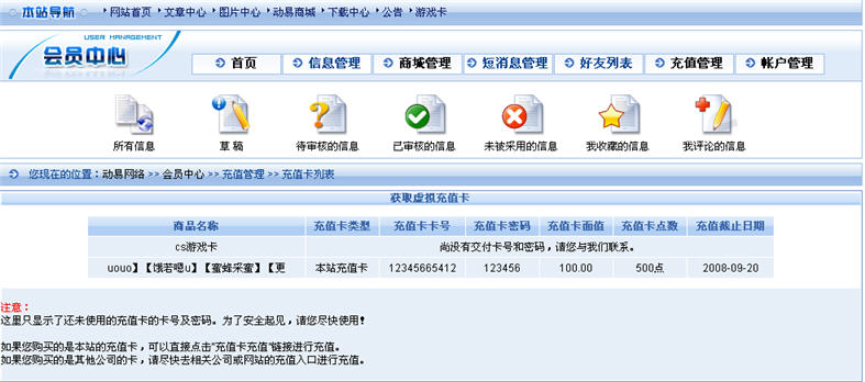 好了,以上步骤全部完成后,充值卡就可以在前台商城中出售了,客户可以像购买其他商品一样购买充值卡,而且动易eShop2007还具备自动交付充值卡的功能。客户在支付完毕货款后,管理员在后台订单管理页面可以直接点击“交付充值卡”来发货,随后客户即可在前台会员中心里直接提取到充值卡卡号和密码。