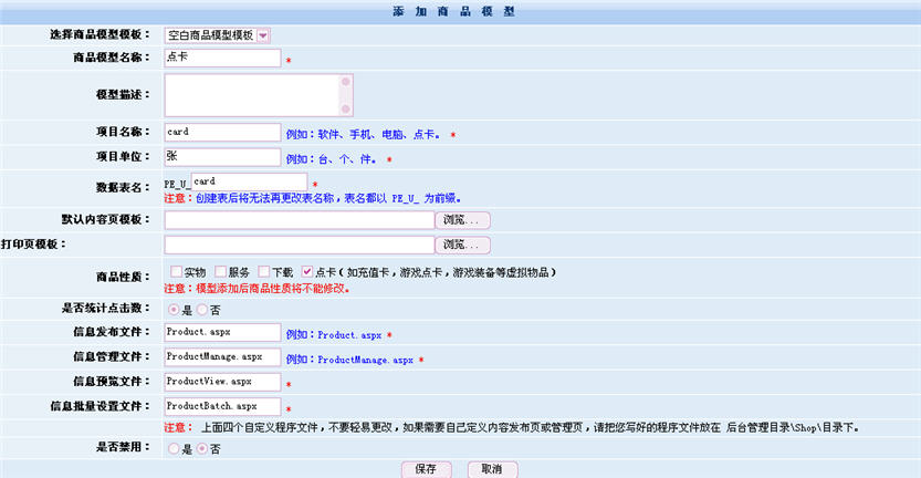 首先,我们需要添加一个点卡类的商品模型。这里,尤其要注意的是需要将“商品性质”勾为选“点卡”,否则将无法使用点卡销售的功能。